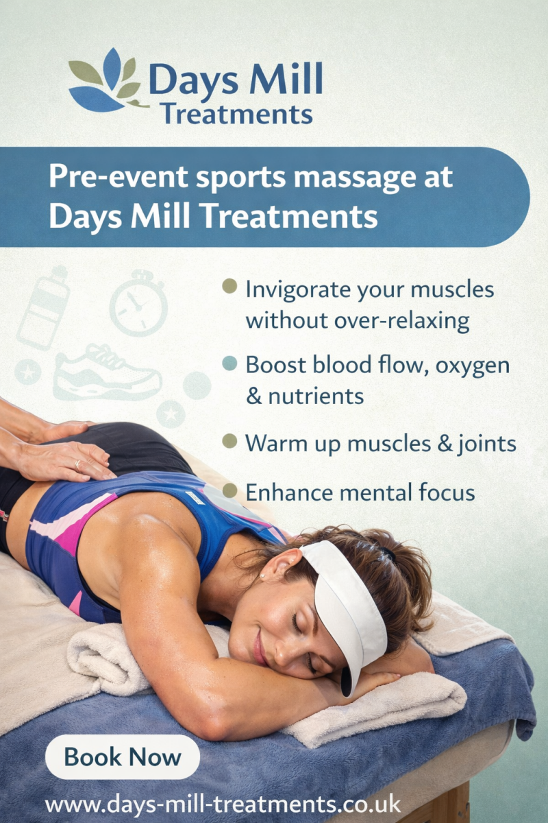 At Days Mill Treatments, pre-event sports massage is designed to prepare your body and mind for peak performance—without over-relaxing your system.